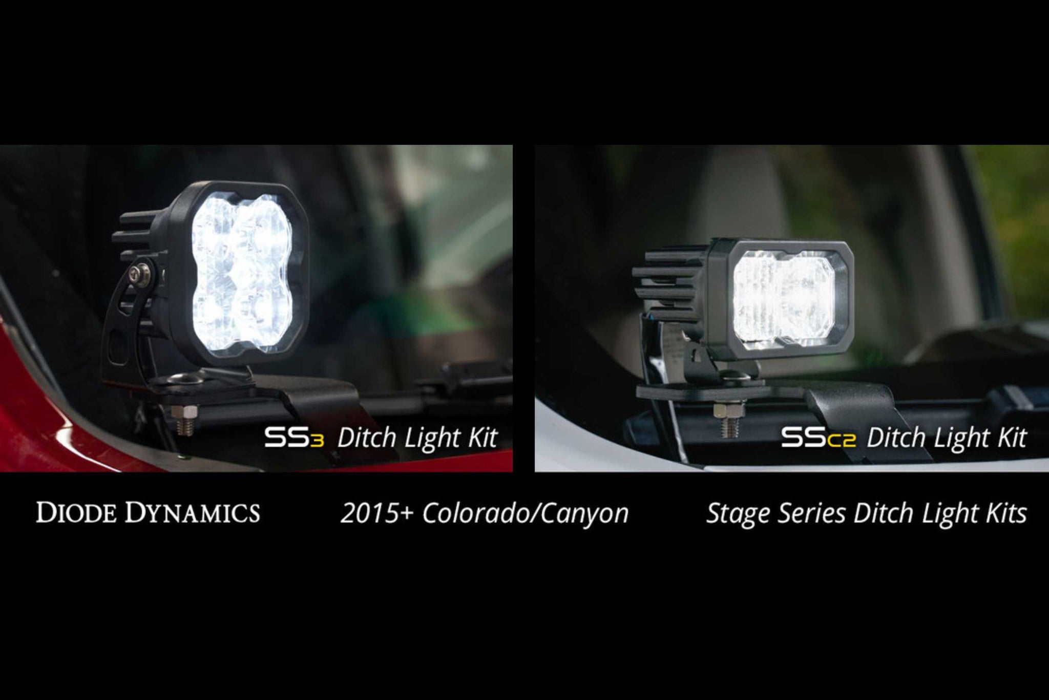 Perfect fitment. The Stage Series LED Ditch Light Kit for the 2015-2020 Chevrolet Colorado allows you to easily mount two SS3 or SSC2 Pods above the hood. These application-specific brackets were CAD-designed to install using factory mounting points. No cutting or drilling required! This kit features a low profile design while minimizing glare, and will not interfere with raising or lowering the hood. Built to last. The brackets in this kit are constructed out of thick-gauge stainless steel. Unlike other options made out of mild steel, these brackets are full stainless steel and won't corrode over time. With their thick-gauge construction, you also won't experience any vibration or bouncing while driving. Focused. Traditional optics like reflectors or simple lenses lose light internally and to glare, so not all of the light shines on target. Instead, the custom-engineered TIR optic in the SS3 and SSC2 collects all of the light from the LED, and directs it only where you need it, drastically reducing glare and improving total efficiency.From there, while other options on the market lose as much as 10% of the light output shining through an outer lens, the custom-molded TIR optic in the SS3 and SSC2 serves as both the optic and main lens for greater efficiency and light output. Thanks to this innovative feature, when coupled with high-intensity LED chips, the total intensity of the Stage Series Pod is much greater than other LED pods using basic optics or reflectors with a standard outer lens. Functional output. All Stage Series beam pattern options were designed with optical simulation model'g, to shape the output in a highly-functional beam pattern. No matter what your auxiliary lighting needs are, there is a Stage Series optic for you! Driving is designed to supplement your high beams, but it's great for general illumination as well. Rather than a traditional "spot" pattern, the Stage Series Driving pattern shines in an 18x8 degree spread, providing just enough width to fully illuminate the road ahead at high speeds. Combo combines both the Driving and Flood optics. It shines light downrange in a focused, rectangular 40x20 degree pattern. The combo lens features a flood optic on one side and a driving optic on the other. Legal. For states that require them, we also offer snap-on covers for your SS3 and SSC2 Pods. These covers are available in a variety of colors and keep your Stage Series Pod clean and protected from dirt, dust, or whatever else the road throws your way! White or Yellow. All Stage Series LED pods are available in a cool white or selective yellow color. The white is a 6000K color temperature, which is a true cool white output, and matches most factory LED lighting. The selective yellow is a 3000K color temperature, great for high contrast in poor weather or a distinctive look on the road. We also offer replacement lenses that allow you to change the color or optic of your SS3 or SSC2 Pods. Sport or Pro. Stage Series LED pods are available at two different power levels. Both options use high-intensity LED emitters, and TIR optics for unmatched focus and overall output. However, the Pro option is double the amount of total power. Click the Specifications tab to see more information. Backlight Functionality. All SSC2 Ditch Light Kits include a distinctive Amber backlight feature. The SSC2's backlight fully illuminates the TIR optic, providing a more unique and modern look than the small indicator LEDs found in other products. Proven Reliability. Stage Series LED lighting has been extensively tested for long-term operation from -40 to 185 degrees F, along with vibration, moisture intrusion, and corrosion testing. All of these tests are completed to SAE standards, just like factory components. They've also been put to the test on-road by racers and enthusiasts alike.