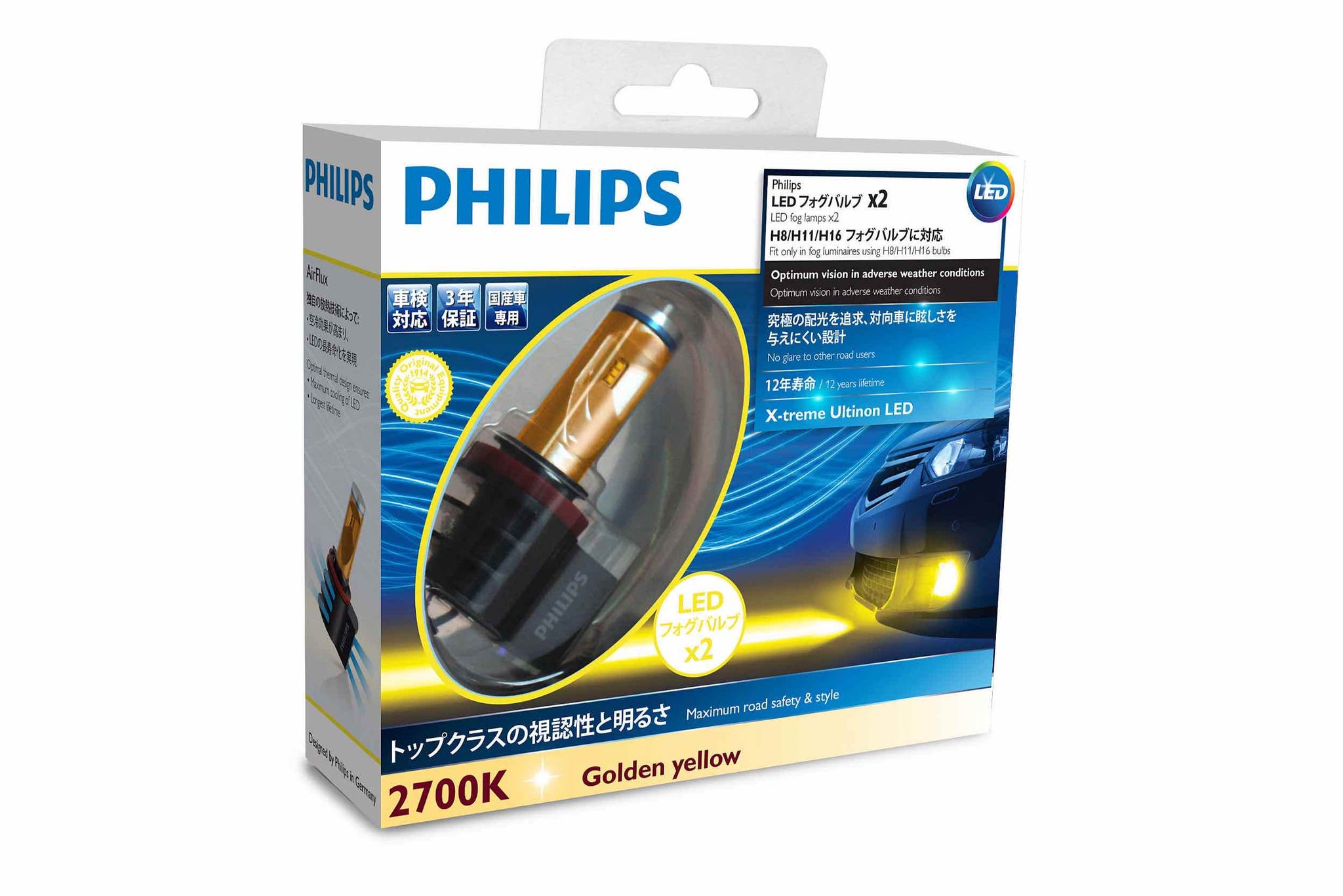 Powerful bright light, directed exactly where you need it: The best car lights are not simply the ones that produce the strongest light. Creating ever brighter LED bulbs for cars is the easier task. It's what you do with that extra light that matters. Uncontrolled bright light is not ideal for driving and can create dangerous glare. Fitted with SafeBeam technology, Philips LED fog lights concentrate light where you need it. The uniform and accurate beam pattern is designed according to road safety regulations for halogen headlights. With more precise control of light, you have greater visibility, making you a better and safer night-time driver. 2700 Kelvin color temperature for adverse weather: With a color temperature of up to 2700 Kelvin, the Philips X-tremeUltin On LED fog lights improve vision in adverse weather conditions, penetrating fog better reducing glare and improving contrasts. 6500 Kelvin color temperature for crisp white light: With a color temperature of up to 6500 Kelvin, the Philips X-tremeUltin On LED headlight based on automotive grade LUXEON technology produces a bright white, daylight-like beam. With clearer vision you're better able to spot obstacles and take the perfect driving line. And as you don't have to strain to see the terrain ahead, brighter lights make for a more comfortable and exciting night-time drive. Upgrade your lights, upgrade your style: Just like our eyes are windows into our souls, so your headlights say a lot about your car. If you're looking to upgrade your style, without buying a newer car, upgrading your headlights is one of the smartest ways to spend your money. Your car is an expression of who you are, so make a style statement with Philips LED fog lights. Durable headlights that can last as long as your car: You want bright and stylish fog lights. But you don't want to keep replacing failed lamps. That's a major weakness of conventional headlights; the more powerful the light, the shorter its lifespan. At a higher light intensity level, LEDs last much longer, and Philips X-tremeUltin On LED products show superior durability. Due to features such as AirFlux and AirCool heat management systems, they last up to 12 years. With most cars replaced or upgraded within that time, your stylish new headlights should last you the lifetime of your car. Innovative heat management systems for more lifetime: LED fog lights generate heat that needs controlling. Philips AirFlux and AirCool technologies is a smart cooling system that diverts heat away from the light's critical components. By increasing heat resistance, Philips LED fog lights last longer than other comparable products currently on the market. But durable lights are not just about convenience and value for money, they're also about safety. You don't want your lights to fail while in use. With Philips LED lights you can drive in total serenity. Philips automotive lighting at the highest quality level: The technologically advanced Philips lighting is renowned in the automotive industry, and has been for over 100 years. The Philips Automotive Grade Quality products are designed and developed following strict quality control processes (including applicable ISO norms), leading to consistently high production standards. Major car manufacturers choose Philips lamps, because when you buy Philips, you buy quality. You get powerful bright light, and precise beam performance. You get high-end style. And you get an advanced LED lighting system for a safer, smoother and more enjoyable drive. Easy installation and compatible with many car models: Designed to be easily installed in compatible vehicles, drivers with maintenance experience will be able to upgrade compatible headlights with ease. However, it's recommended that you get your new Philips LED headlights installed by specialist mechanics, they will make sure you're ready to go. While these headlights are compatible with a wide range of existing car models, not all car types are supported. Get 200% brighter light for superior visibility: Driving in the dark is demanding, so you rely on your headlights. Forward and peripheral vision are both important to enhance your driving ability for a safer drive. With an intense bright beam, Philips X-tremeUltin On LED fog lights for cars improve your visibility by up to 200%. Once you experience this daylight, like effect, you'll always prefer LED. The more you can see, the better you perform, the faster you react and the safer you are. So don't let darkness win, choose Philips and start driving at night with greater confidence and control.
