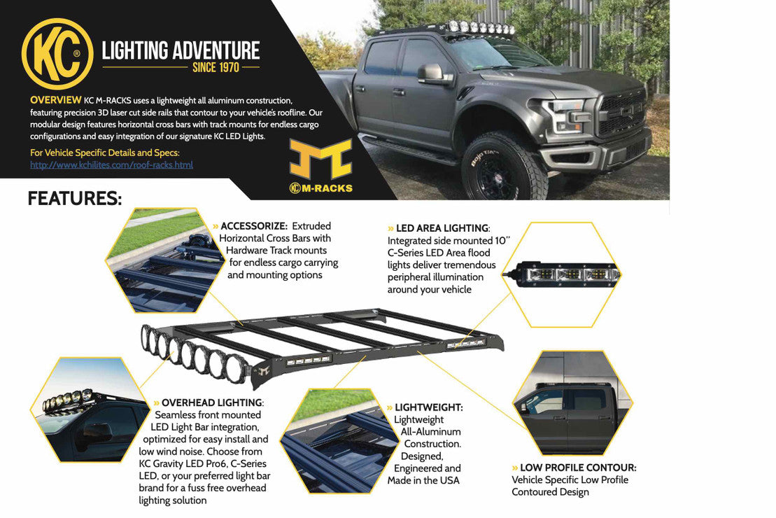 KC SIGNATURE PRECISION DESIGN AND FIT: KC M-RACK roof racks offer low profile aerodynamics and strength, with modularity to meet your cargo carrying needs. Utilizing a lightweight all aluminum construction, KC M-RACKs only weigh around 25 lbs, practically unchanging your vehicle's center of gravity or factory curb weight. Our roof racks provide you peace of mind, minimizing roof clearance while maximizing cargo carrying capacity. Using advanced vehicle scanning, 3D model'g and precision laser cutting, KC M-RACKs are engineered specifically for your 14-19 Chevy/GMC 1500-3500 truck's roofline. What you get is a precise, form fitting design that contours the roofline of your vehicle and eliminating any unsightly gaps or awkward positioning often found with standard "Universal" roof rack offerings on the market. PRACTICALITY AND MODULARITY BUILT IN: KC M-RACKS are designed to scale with your needs. From the integrated lighting, to our unique hardware tracks expanding what you can do with your rack are endless. INTEGRATED C-SERIES CURVED LED LIGHT BAR: This KC M-RACKS also includes your choice of off road LED Light bar. You can either go with an integrated Curved 50" C-Series LED light bar system that provides 27,000 raw lumens of light output in a balanced combo beam pattern for powerful forward and side illumination. Or, you can choose an integrated 50" Gravity LED 8-Light Pro6 light bar setup, which delivers 19,616 lumens of light output, with unparalleled light distance, performance and clarity to deliver light where you need it most. In Addition: to the Integrated KC C-Series Curved LED Light Bar or Pro6 setup on the front, your M-Rack setup accommodates (4) KC C-Series Area LED Flood Lights, two on each side. Talk about 360 visibility! Other Features: Precise Vehicle Specific Low-Profile Contoured Design: Typically, only adds 2.75" to peak vehicle height. Lightweight All-Aluminum Construction. Engineered to Support Full OEM Rated Load Capacity of your vehicle. Horizontal Cross Bars with Hardware Tracks offer endless accessory mounting options. Wiring harnesses included.