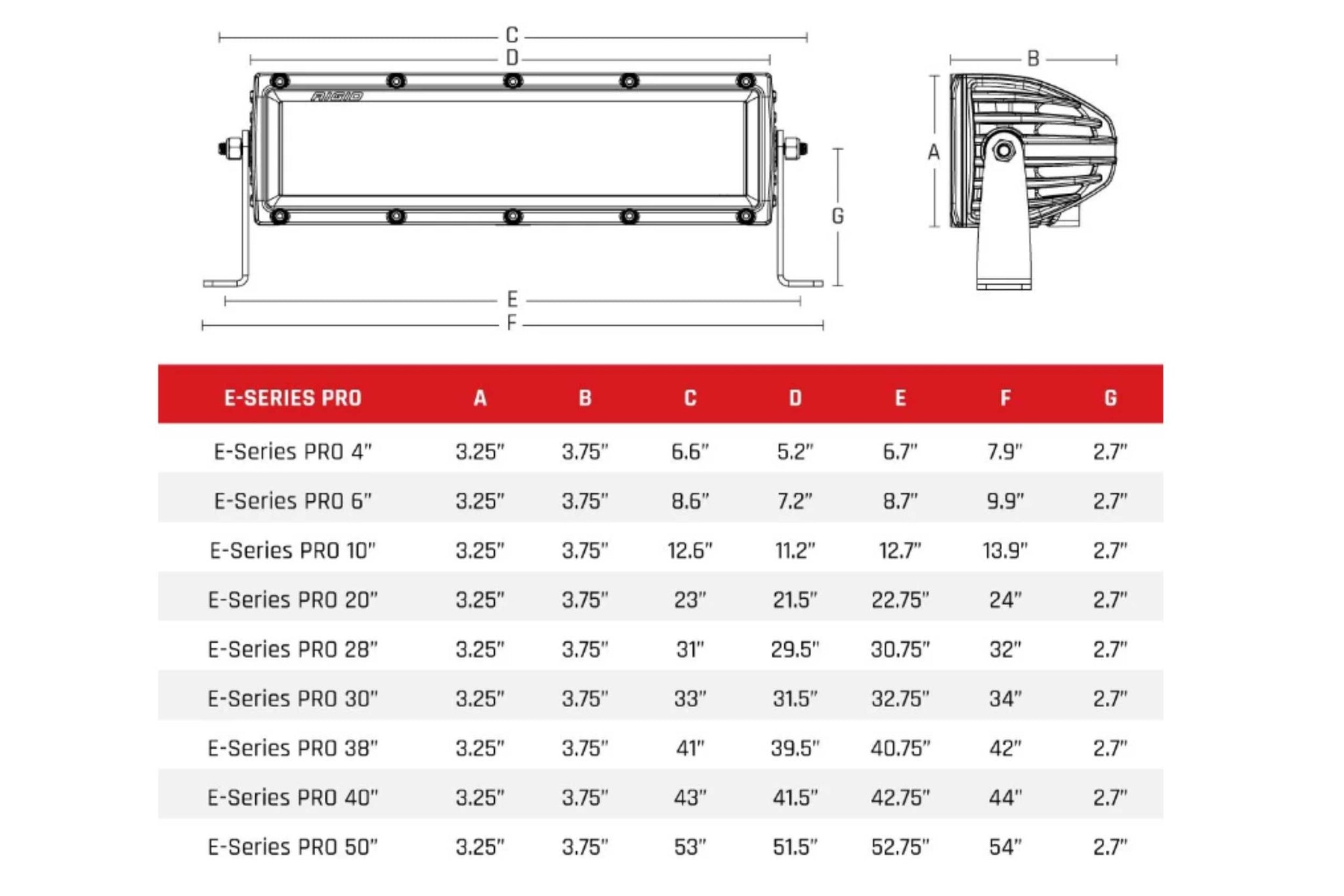 OVERVIEW: The E-Series is one of RIGID's most versatile, all-around lighting solutions, and recent enhancements in LED technology delivering up to 111% more raw lumens than ever before with the E-Series PRO. Among RIGID's most popular product lines, the E-Series PRO has recently benefited from several upgrades to improve both looks and performance. Plus, new branding and new blacked-out circuit boards give the E-Series PRO a more refined look. Available with your choice of optics, the E-Series features a host of beam options, including Spot, Flood, Driving, Hyperspot, Diffused, and new Driving/Spot and Spot/Hyperspot combinations. These and other innovations make it one of the brightest and most efficient LED light bars on the market. The E-Series was born in off-road, but its versatility makes it well suited for use with power sports, marine, general automotive and even first responder applications.